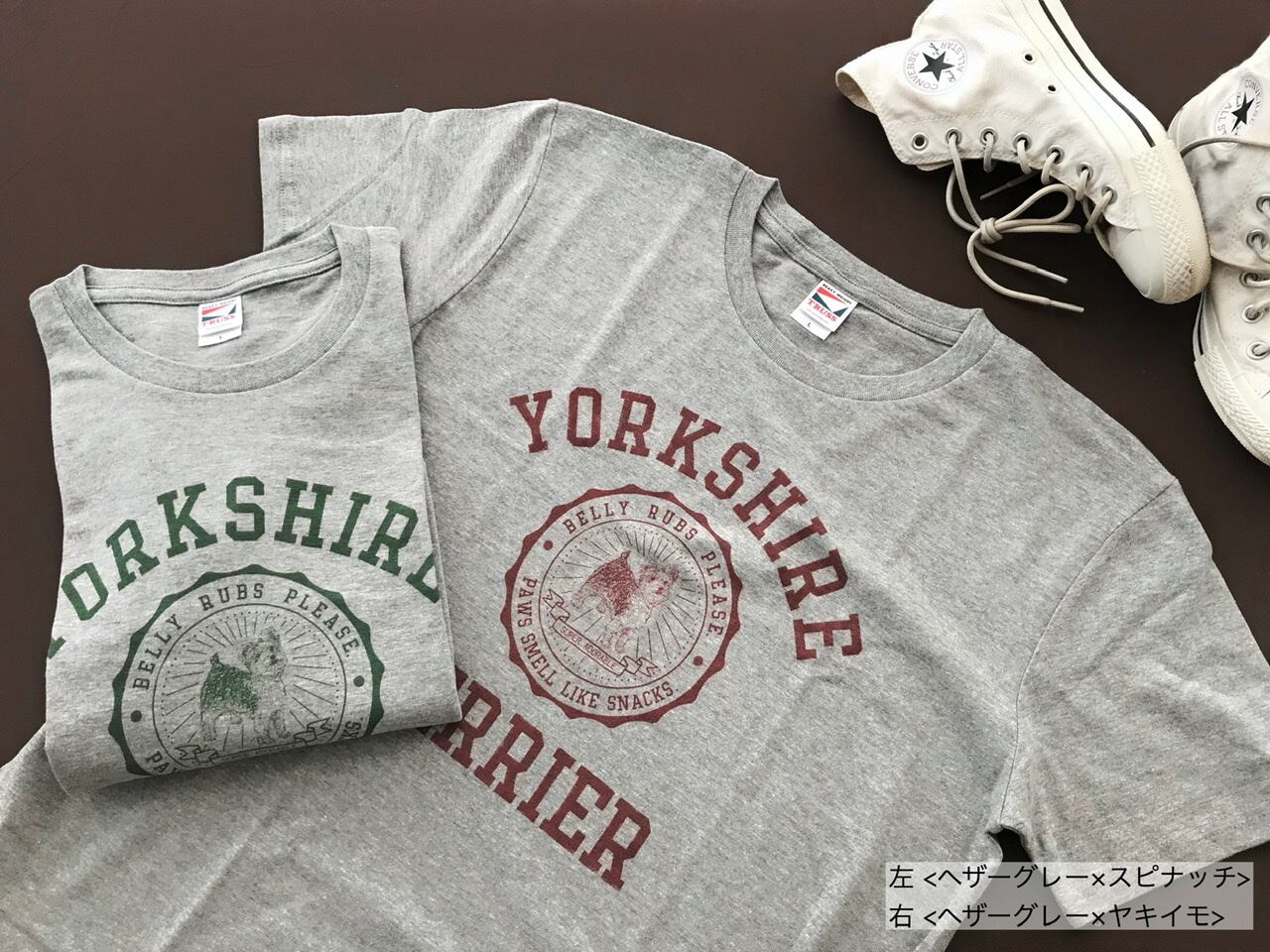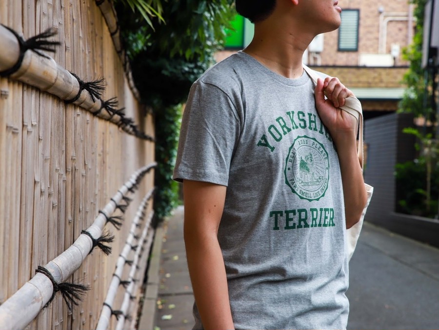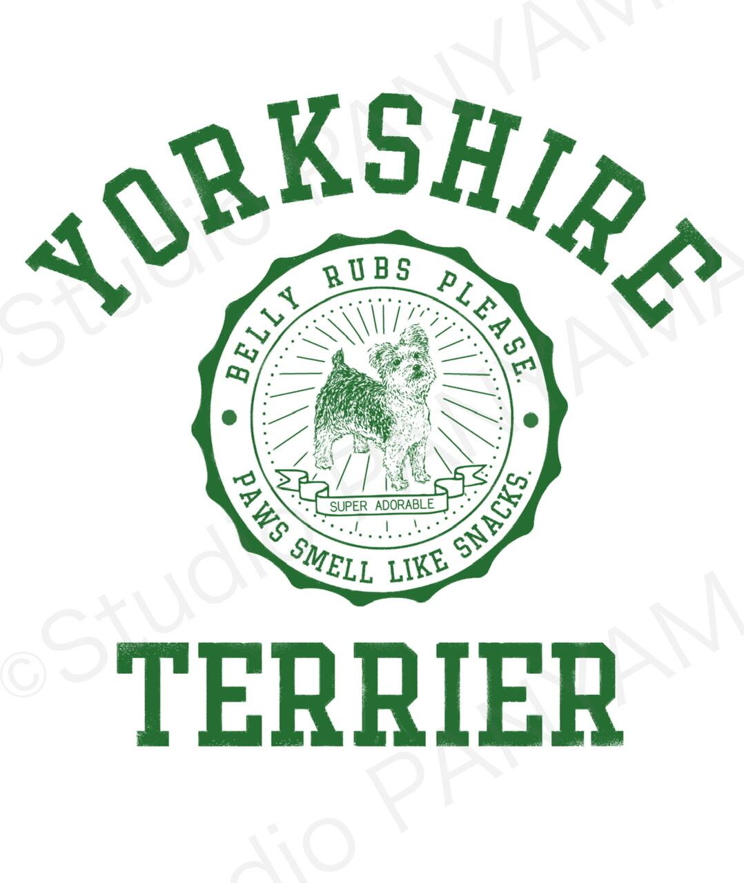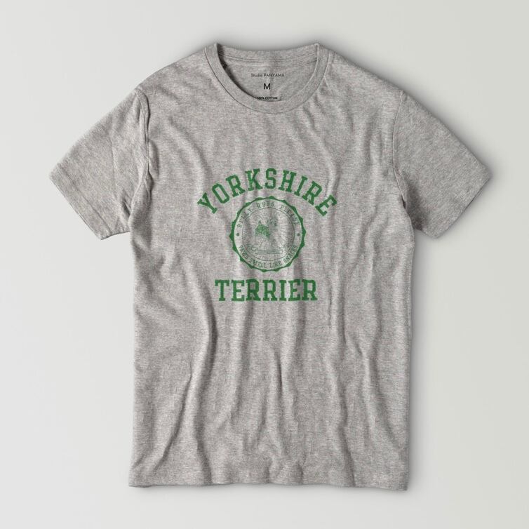 ヴィンテージライクな、ヨークシャーテリアのカレッジ風プリントTシャツです。
