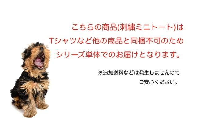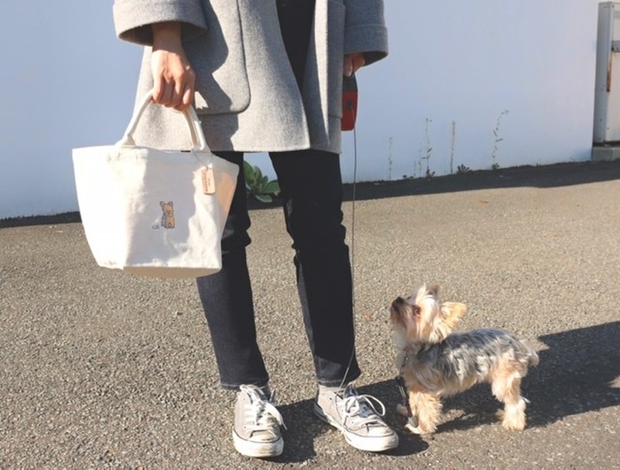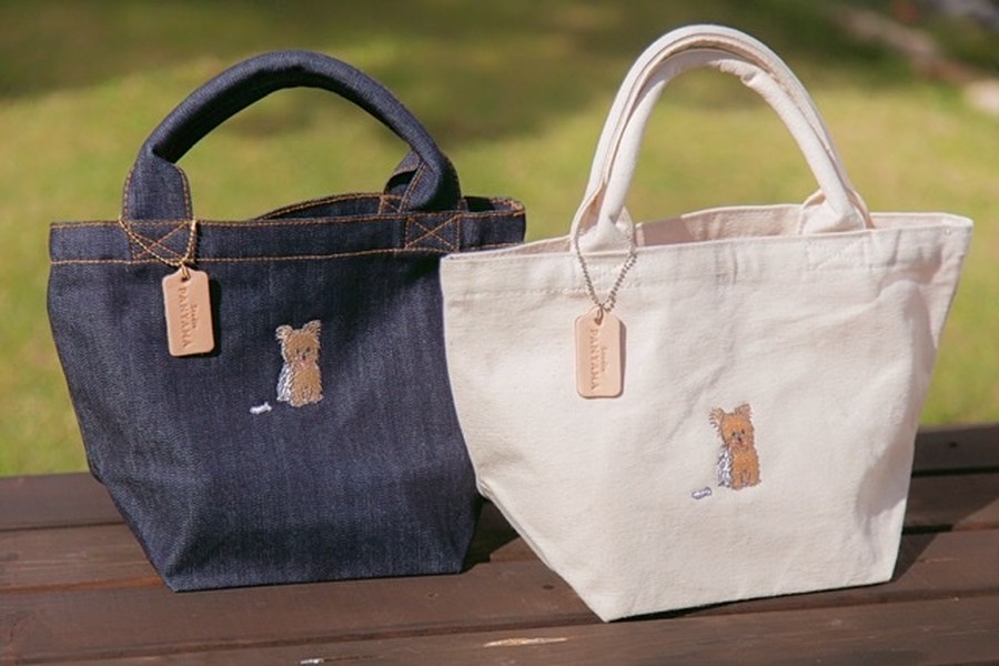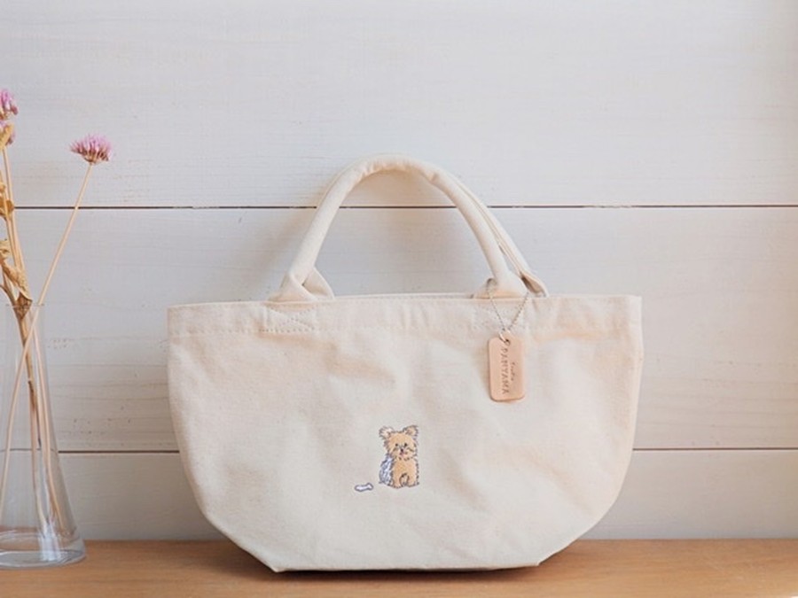 自然の風合いを大切にしたエコマーク付き無漂白のキャンバス生地には、ペールトーンのやさしい色合いでまとめられたヨーキーの刺繍がポイントになっています。