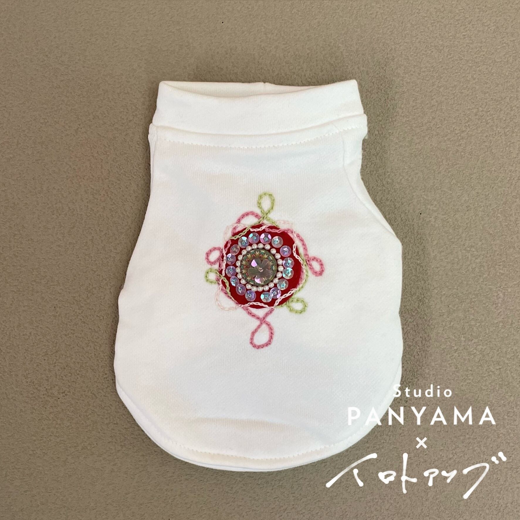 ペット用のウエアに手縫いでの刺繍を施した1点ものとなります。